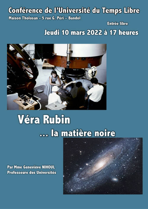 Nous rendrons hommage à cette femme remarquable qui n’eut jamais le prix Nobel à la surprise de nombreux physiciens. Nous terminerons par un état des lieux sur nos connaissances concernant la matière noire.