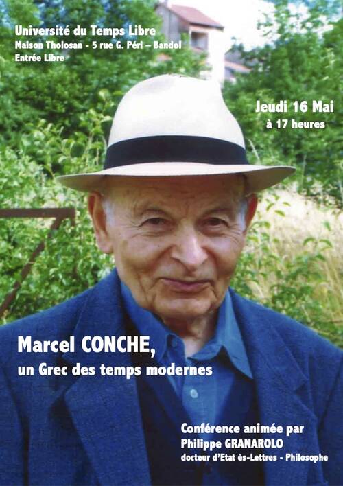 J’ai eu le privilège d’être son ami et de dialoguer avec lui à de nombreuses reprises, et je voudrais faire bénéficier le public bandolais de cette longue fréquentation. Mon objectif est de démontrer en quoi Marcel Conche est un philosophe grec, qu’il est, dans la seconde moitié du XXe siècle et dans les deux premières décennies du XXIe siècle, l’héritier d’Homère et des antésocratiques, le fidèle disciple d’Anaximandre, d’Héraclite, de Parménide, de Pyrrhon, etc.
